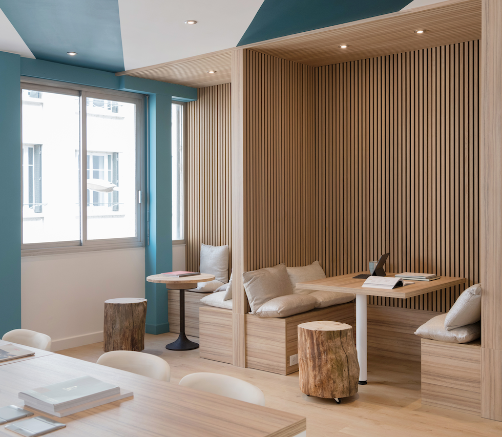 Ainsi, il est aisé de se mouvoir entre zones « calmes », groupes de travail et espaces privatifs en fonction des besoins de l’instant. Par ailleurs, de nombreux panneaux acoustiques ont été installés. Composés d'une base en feutre et recouverts de tasseaux plaqués bois, ces derniers permettent d’atténuer la résonance au sein même des espaces communs.